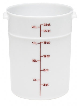 Keep your operation running smoothly with the Cambro 22 Qt Round White Food Storage Container from Cambro. Designed for use in demanding foodservice environments, this product delivers the durability and performance you've come to expect from the Cambro brand. Whether you’re streamlining your service, maintaining food temperature, or offering a safe and efficient seating solution, this Cambro product ensures dependable results shift after shift.