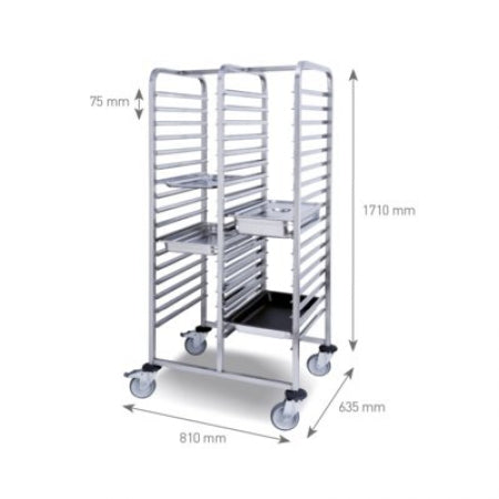 | Product | Double rail trolley 17 x 2 for 1/1 GN pans, Entrance 325 mm, @75mm each Rail,Size: 810 x 635 x 1710 mm |