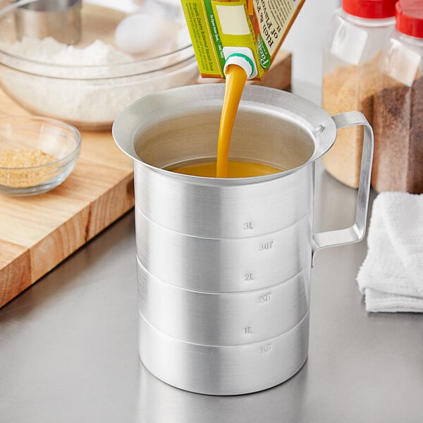 This 4 qt. measuring cup is a must-have for portioning stocks, oils, water, batter, and other liquid or dry ingredients in large quantities. It's built to withstand the rigors of any professional kitchen.